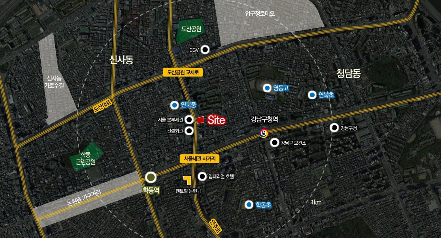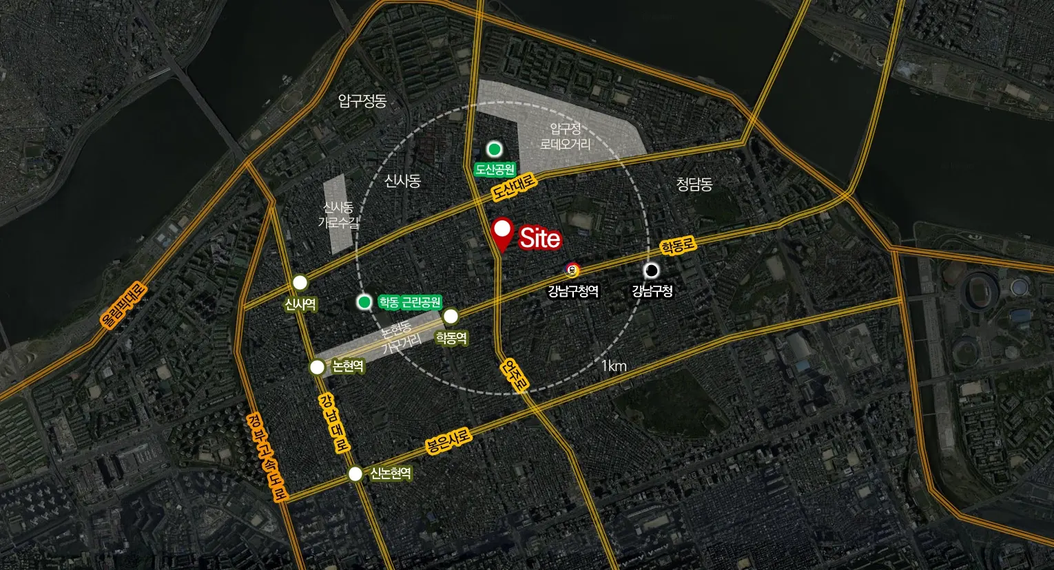도산대로 및 학동역, 강남구청역, 강남구청 등 1km 이내 위치