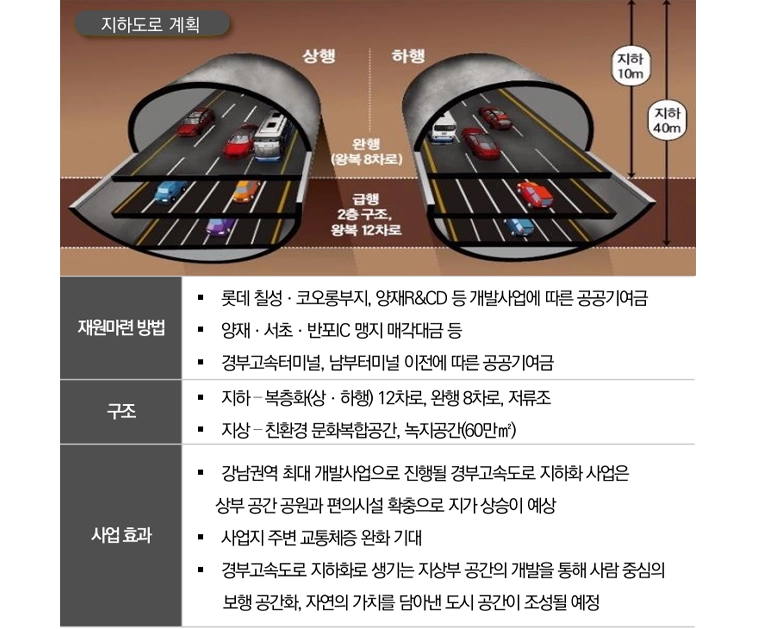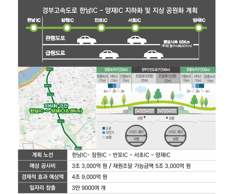 양재IC ~ 한남IC 지하화, 상부공간 여의도공원 2.5배 규모의 대규모 공원 조성 예정